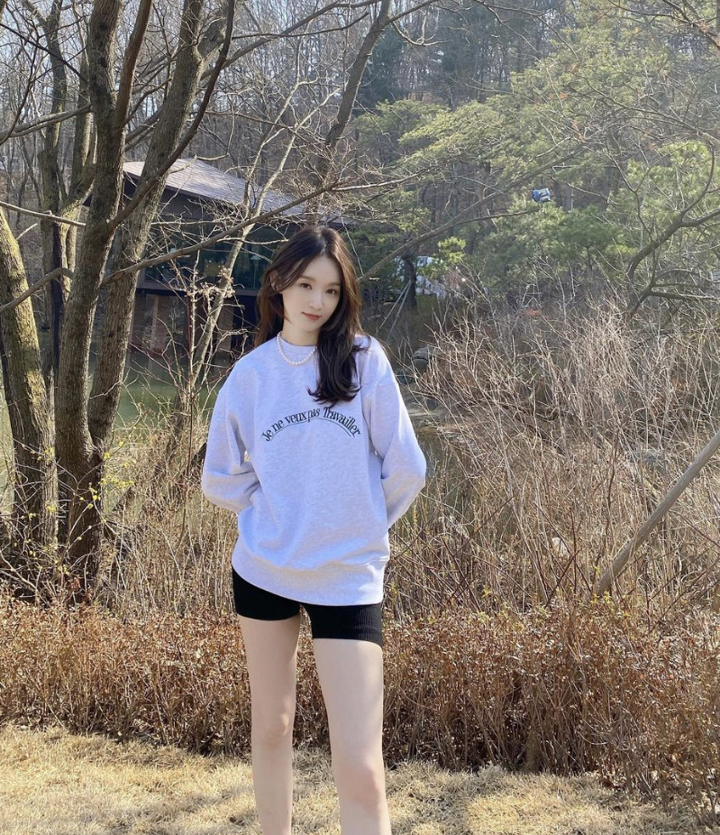 허벅지 중간쯤 오는 바이크 쇼츠를 입고 박시한 상의를 입어주면 비율이 좋아 보입니다.