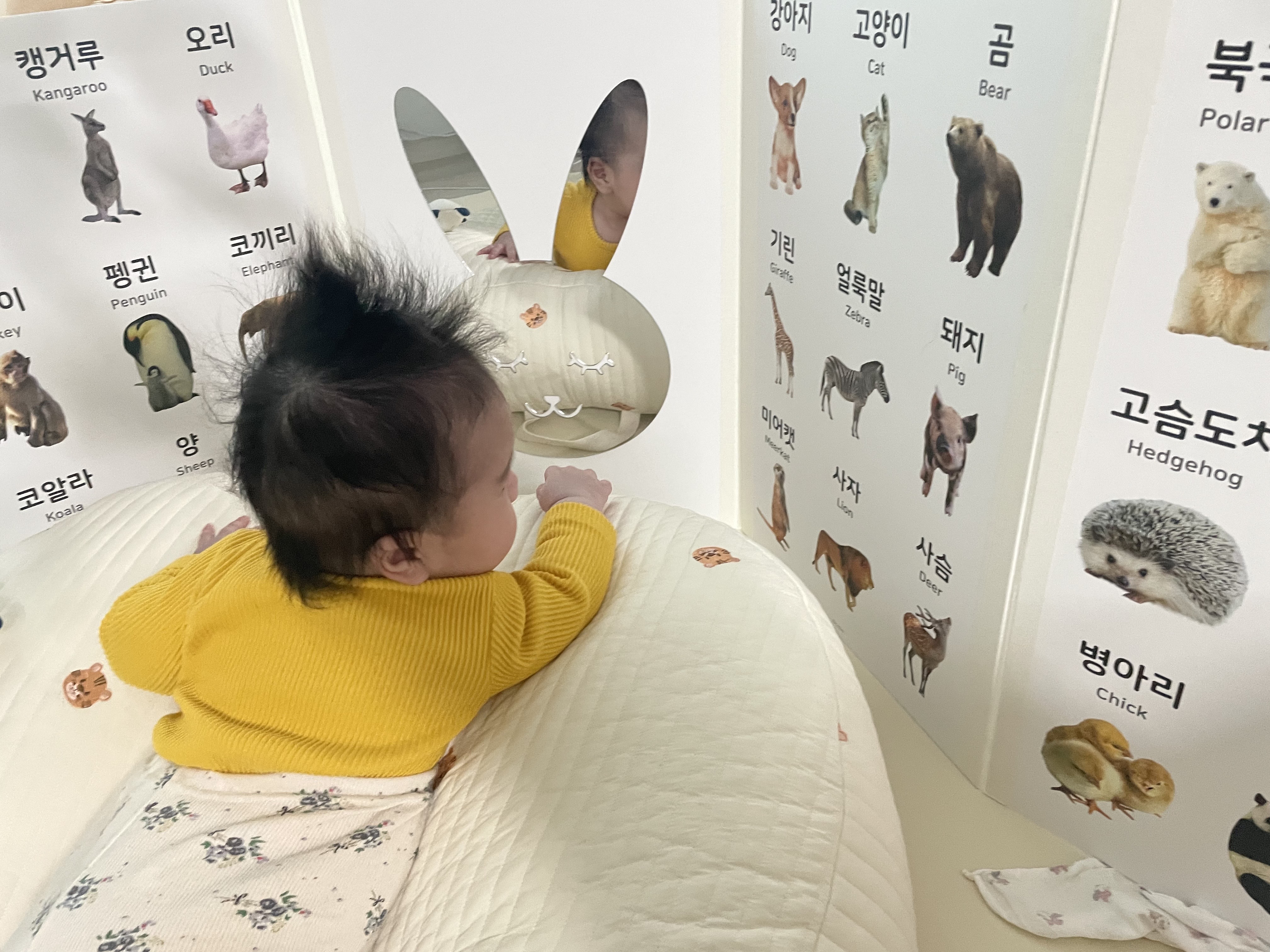 엎드려서 위, 아래, 좌우 등 다양한 각도로 사물을 볼 수 있기 때문에 아기의 시야가 넓어지고 시각발달에 도움을 줍니다.