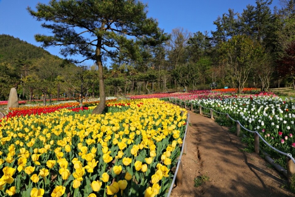 튤립과 수선화, 매화 등 각가지 봄꽃을 볼 수 있습니다. 편백숲, 카페 등 여러시설이 있으며 야외 글램핑장도 운영하여 봄철 가족 나들이 장소로 적합합니다.