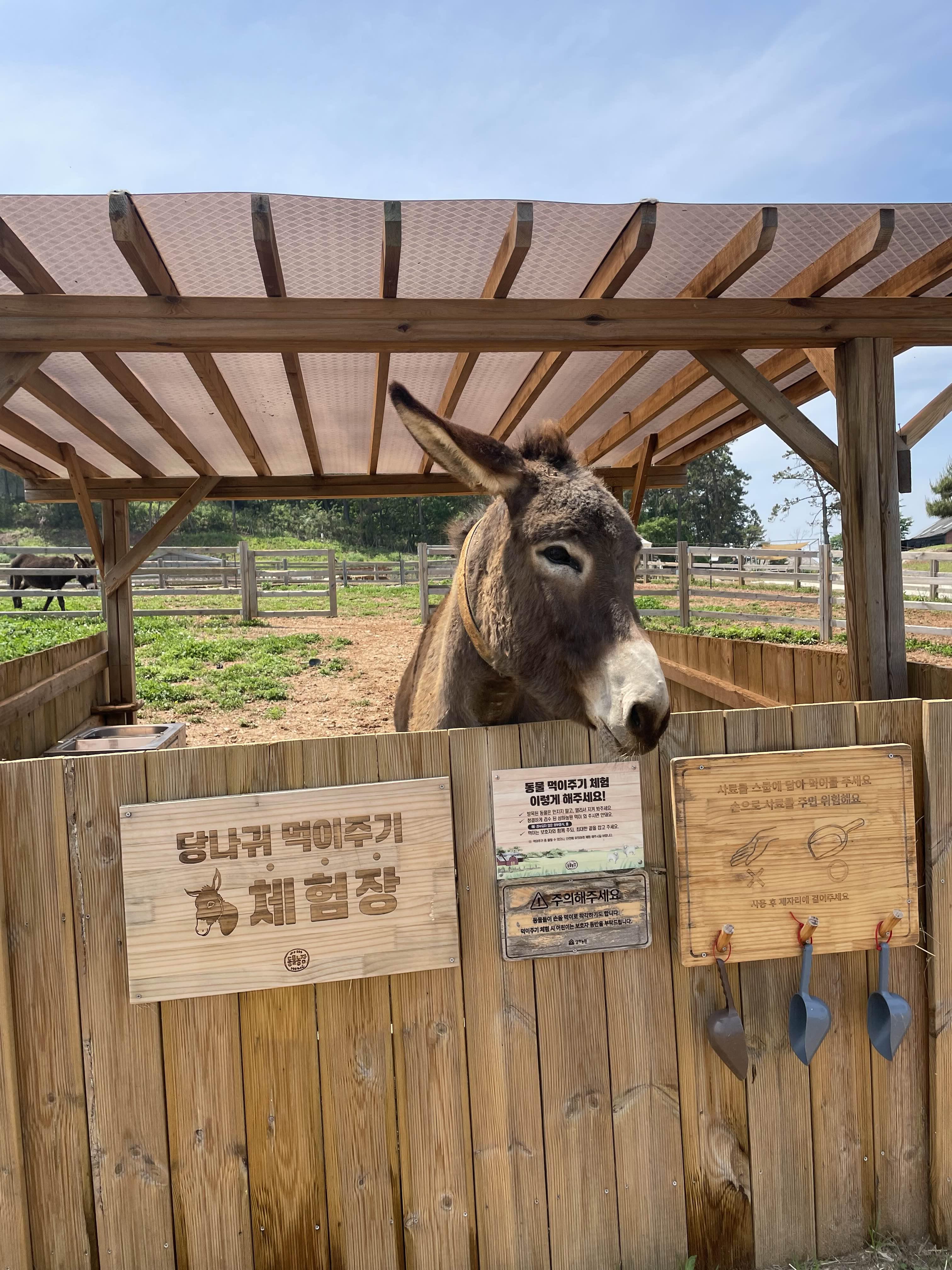 당나귀에게 당근 주기를 체험할 수 있는 곳입니다. 먹이를 판매하는 자판기에서 당근을 구매할 수 있습니다.