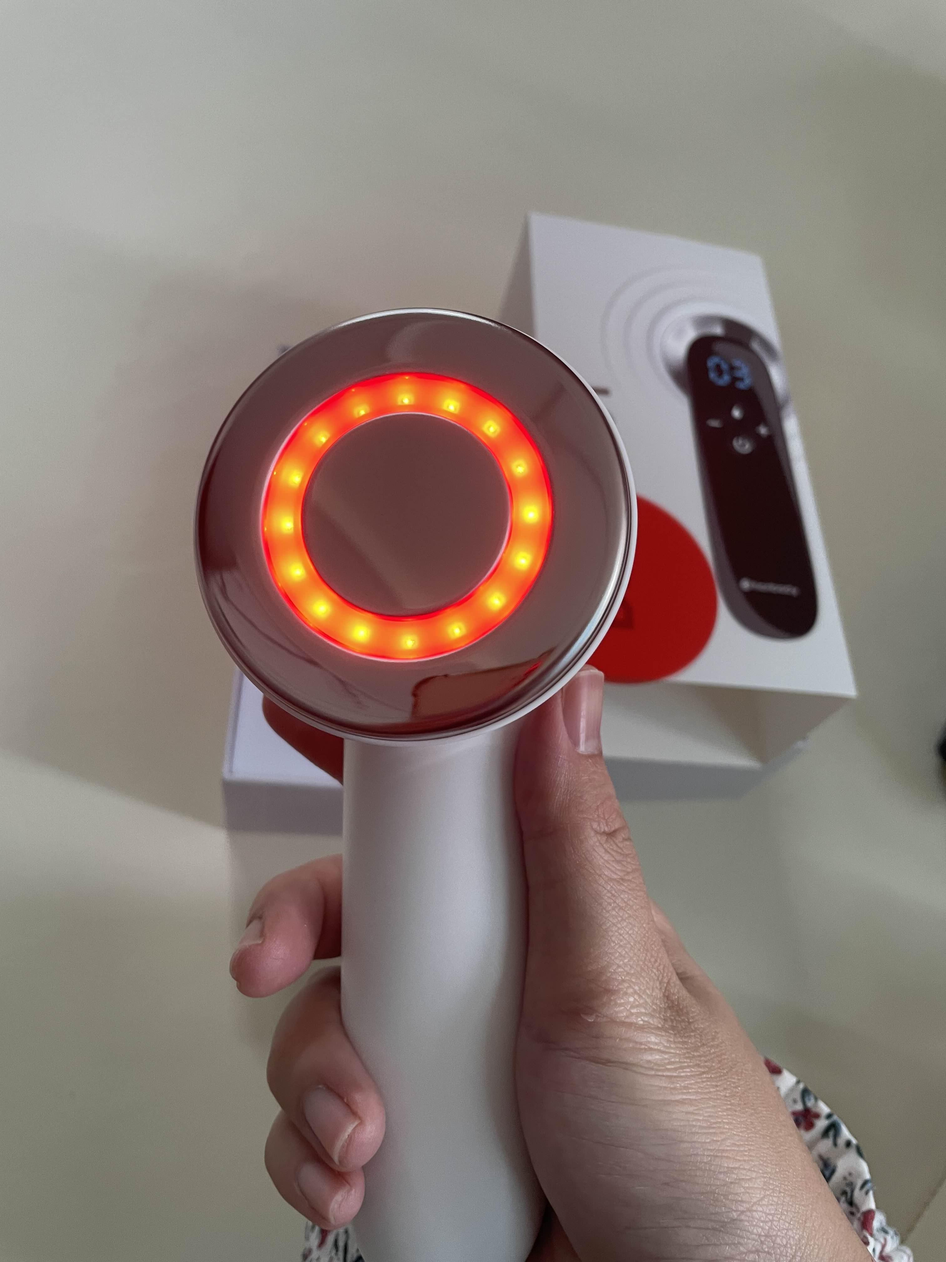 또한 바디 사용 시에는 온열 기능을 사용하고, 얼굴 사용 시에는 온열 기능을 끄고 눈 주위를 피해 턱과 볼 부분에만 집중적으로 사용했습니다.  건조한 상타에서는 전류가 느껴지지 않으므로 크림이나 겔을 도포 후 사용하는 것이 좋습니다. 단, 오일은 사용하면 안 된다고 합니다.